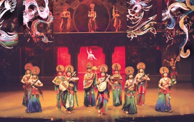 1月9日晚,乐动敦煌(敦煌)文化旅游产业发展有限公司的演员在大型洞窟沉浸式体验剧《乐动敦煌》中表演。