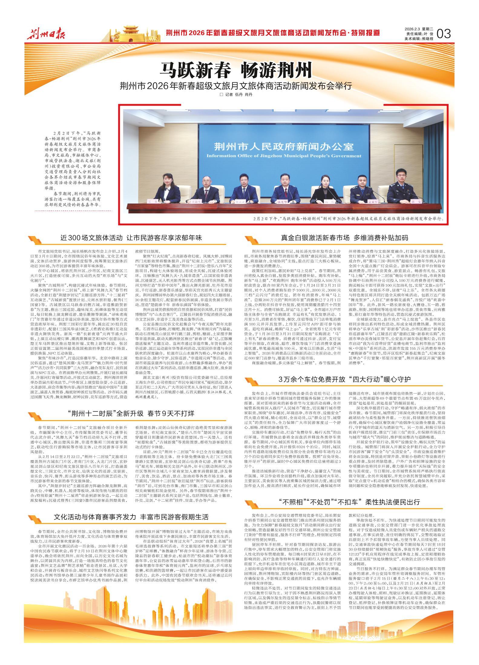 2月2日下午,“马跃新春·畅游荆州”荆州市2026年新春超级文旅月文旅体商活动新闻发布会举行。市商务局、市文旅局、市融媒体中心、市城管执法委、湖北文旅(荆州)投资有限公司、市公安局交通管理局负责人分别向社会各界介绍我市春节期间文旅体商活动安排和服务保障举措。