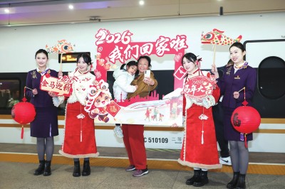 图为2月2日,在上海虹桥火车站,旅客和铁路上海客运段乘务员在G14列车外打卡合影。