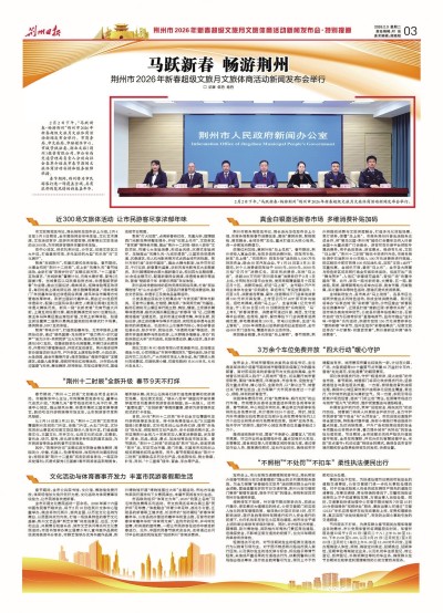 2月2日下午,“马跃新春·畅游荆州”荆州市2026年新春超级文旅月文旅体商活动新闻发布会举行。市商务局、市文旅局、市融媒体中心、市城管执法委、湖北文旅(荆州)投资有限公司、市公安局交通管理局负责人分别向社会各界介绍我市春节期间文旅体商活动安排和服务保障举措。