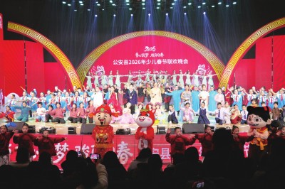 2月10日晚,“童心筑梦 骏马迎春”公安县2026年少儿春节联欢晚会在公安剧院举行。晚会通过歌舞、情景剧、武术、相声等不同表现形式,在家国情怀与文化传承的多元表达中,全面展现新时代少年儿童多姿多彩的艺术才华和蓬勃向上的精神风貌,为全县人民献上了一场充满童真与希望的新春文化盛宴。(通讯员 汪敏 贾开慧 毛何睦 摄)