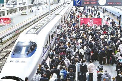 客运方面,2月15日(腊月二十八)至2月23日(正月初七),铁路探亲流、务工流、旅游流交织叠加,客流保持高位运行,全国铁路累计发送旅客1.21亿人次,日均1341万人次,其中2月23日(正月初七)发送旅客1873.3万人次,创春运单日旅客发送量历史新高;日均开行旅客列车12380列,节前节后客流高峰期在京广、京沪、沪昆、京哈等主要高铁干线通道单日安排开行夜间高铁列车超1000列,及时在热门方向和区间增开临时旅客列车,单日最高增开2314列。