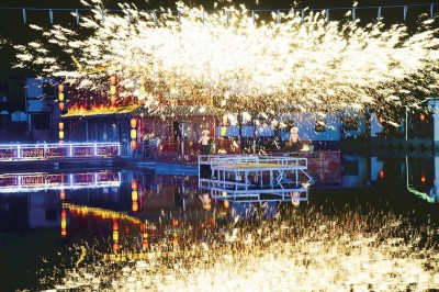 夜幕初垂,护城河水波潋滟,乐声悠扬而起。一位“仙女”立于五彩凤凰之上,在河面上空缓缓移动,衣袂翩跹,彩带翻飞,与漫天灯火交相辉映,恰如“东风夜放花千树”的诗意画卷。