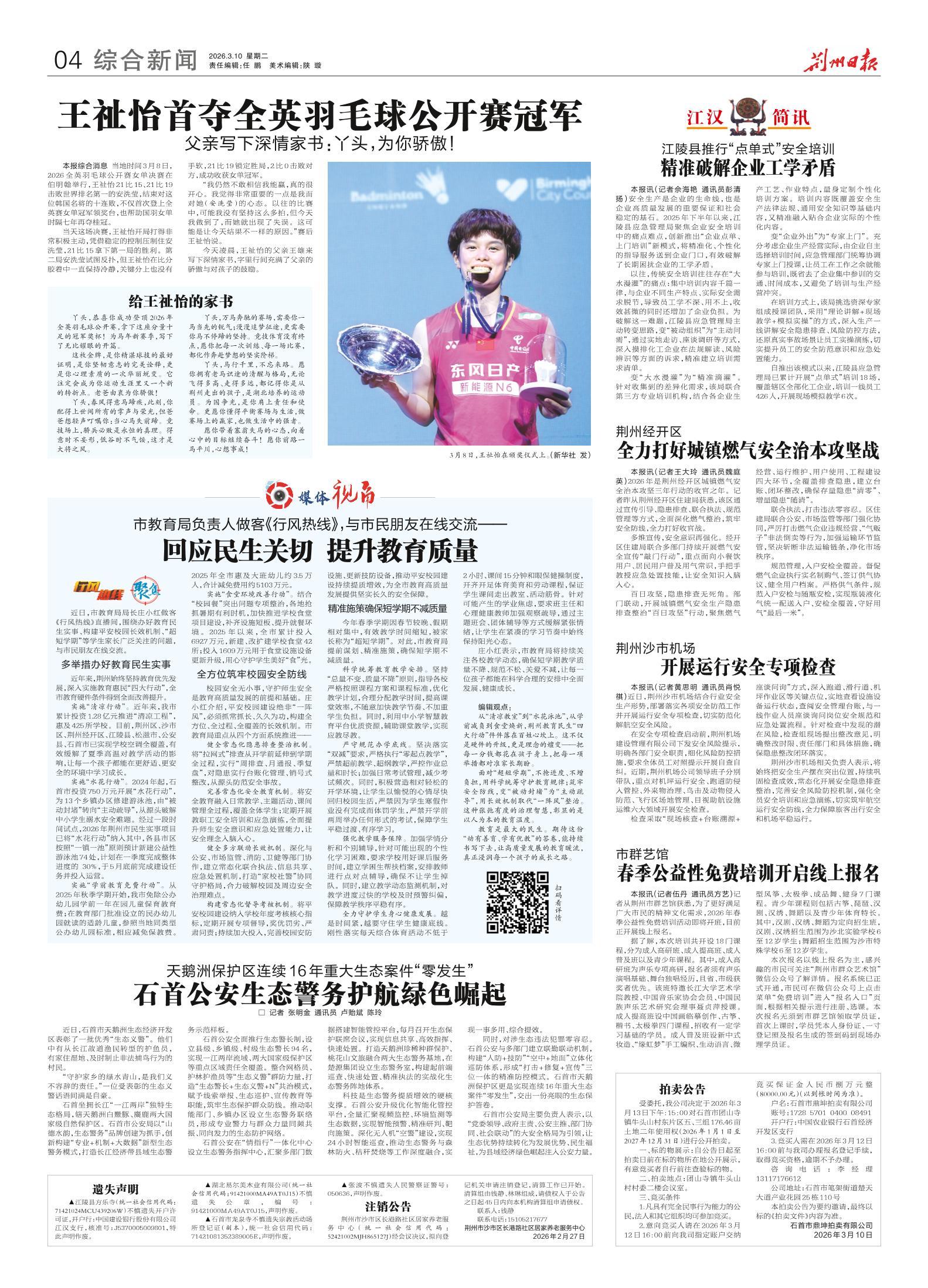 《荆州日报》(电子版)的一切内容(包括但不限于文字、图片、PDF、图表、标志、标识、商标、版面设计、专栏目录与名称、内容分类标准以及为读者提供的任何信息)仅供荆州日报读者阅读、学习研究使用,未经荆州日报及/或相关权利人书面授权,任何单位及个人不得将《荆州日报》(电子版)所登载、发布的内容用于商业性目的,包括但不限于转载、复制、发行、制作光盘、数据库、触摸展示等行为方式,或将之在非本站所属的服务器上作镜像。否则,荆州日报将采取包括但不限于网上公示、向有关部门举报、诉讼等一切合法手段,追究侵权者的法律责任。