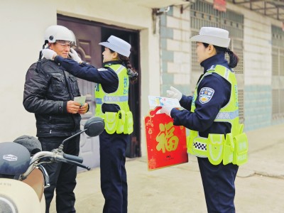 交警带着定制的春联和安全头盔,走进村庄院落。