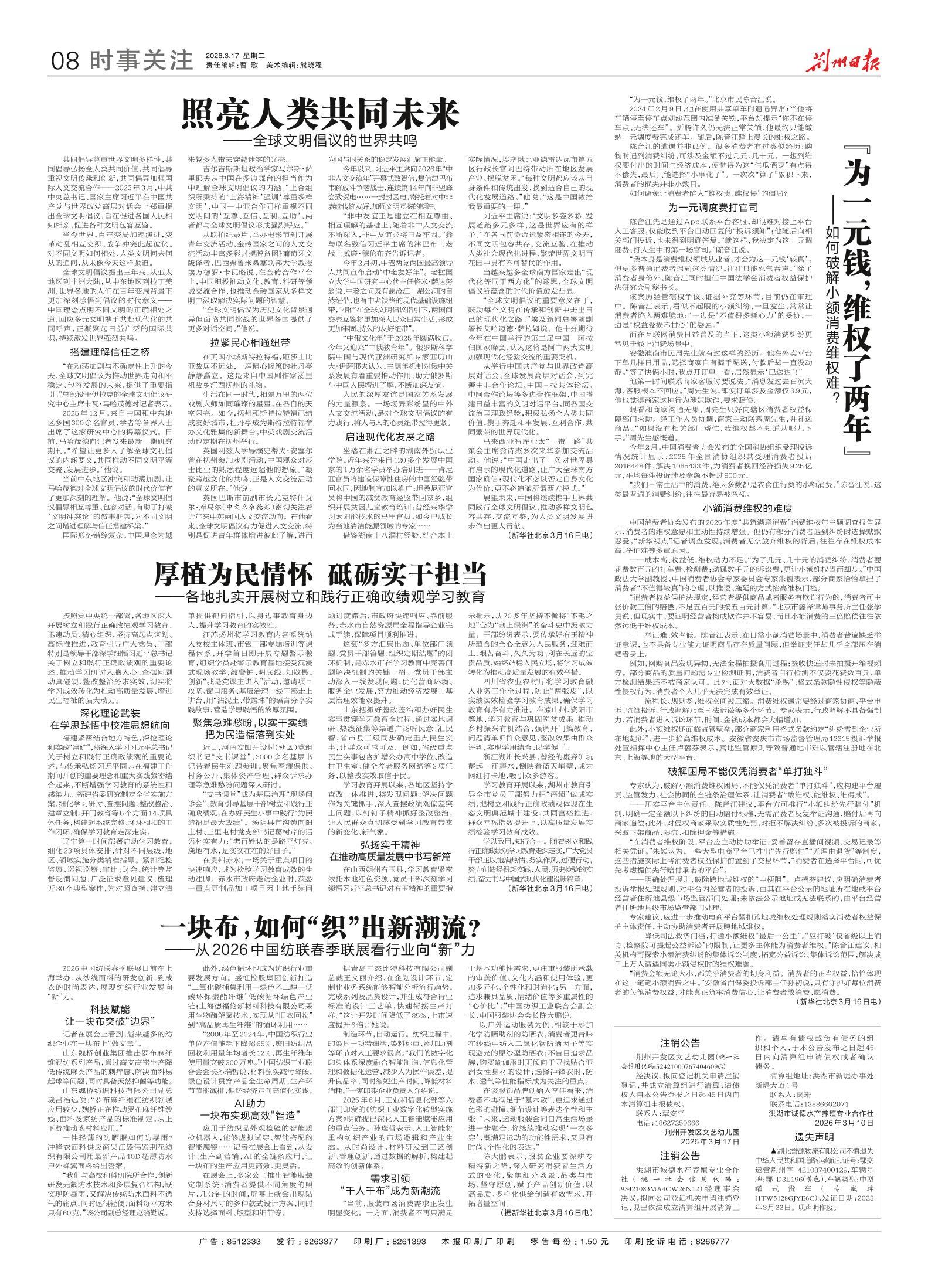 《荆州日报》(电子版)的一切内容(包括但不限于文字、图片、PDF、图表、标志、标识、商标、版面设计、专栏目录与名称、内容分类标准以及为读者提供的任何信息)仅供荆州日报读者阅读、学习研究使用,未经荆州日报及/或相关权利人书面授权,任何单位及个人不得将《荆州日报》(电子版)所登载、发布的内容用于商业性目的,包括但不限于转载、复制、发行、制作光盘、数据库、触摸展示等行为方式,或将之在非本站所属的服务器上作镜像。否则,荆州日报将采取包括但不限于网上公示、向有关部门举报、诉讼等一切合法手段,追究侵权者的法律责任。
