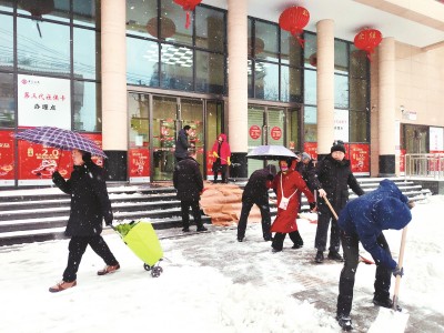 中行荆州分行员工清扫门前积雪,守护客户与居民出行平安。