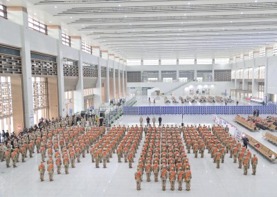 3月20日,全市新兵入伍欢送仪式在荆州火车站北站房举行。新兵们身着戎装、肩披绶带,精神抖擞,开启从军报国、戍边卫国的征程。(记者 胡嫚嫚 胡威虎 通讯员袁华裔 摄)