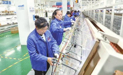 近日,在湖北乐仁汽车电子有限公司车间内,工人们加紧生产汽车线束。近年来,该公司产销两旺,今年一季度产值预计可突破2000万元。(记者 肖琦 通讯员 侯白静 摄)
