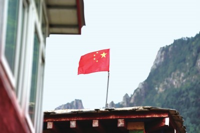 西藏昌都市江达县岗托村一户人家的屋顶上国旗飘扬(2020年9月24日摄)。(新华社 发)