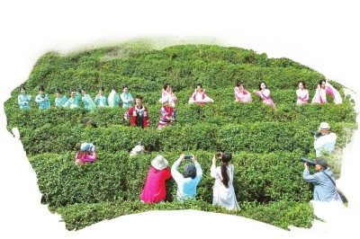 活动现场,一场融合古风舞蹈、民歌对唱与传统茶艺的文艺展演精彩上演,拉开了活动序幕。随后,身着汉服的引导员带领游客步入茶园,茶垄间,民歌爱好者与游客即兴对唱山歌,悠扬的歌声在茶园回荡,为采茶体验增添了几分趣味。在茶农的悉心指导下,游客们认真学习“一芽一叶”的采摘技巧,指尖轻捻间,鲜嫩茶芽落入袋中,不少游客举起手机定格这一春日美好瞬间。