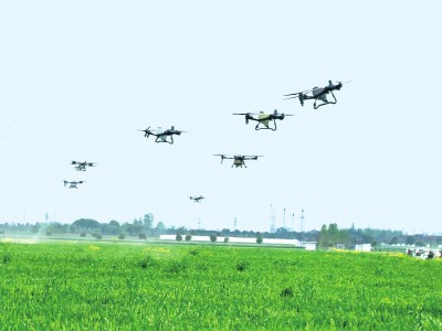 近日,荆州区农业科技服务中心在菱角湖管理区开展小麦病虫害防控现场教学,农技专家现场讲解防控技术,24架无人机同步开展飞防作业,高效解决人工喷药难题。