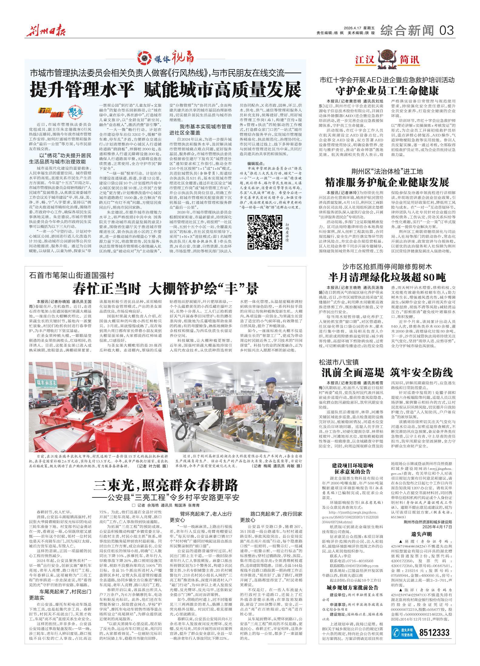 《荆州日报》(电子版)的一切内容(包括但不限于文字、图片、PDF、图表、标志、标识、商标、版面设计、专栏目录与名称、内容分类标准以及为读者提供的任何信息)仅供荆州日报读者阅读、学习研究使用,未经荆州日报及/或相关权利人书面授权,任何单位及个人不得将《荆州日报》(电子版)所登载、发布的内容用于商业性目的,包括但不限于转载、复制、发行、制作光盘、数据库、触摸展示等行为方式,或将之在非本站所属的服务器上作镜像。否则,荆州日报将采取包括但不限于网上公示、向有关部门举报、诉讼等一切合法手段,追究侵权者的法律责任。