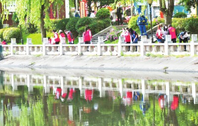 暴雨过后的清晨,空气分外清新,身穿红马甲的青年志愿者们,或是在绿树掩映、芳草萋萋的河岸沟渠边,无数次地重复低头弯腰的动作,清理垃圾;或是协助工作人员打捞清理沟渠与河闸的水面浮萍与漂浮物;或是一起三五成群,齐心协力,清运打扫出来的杂物与垃圾……
