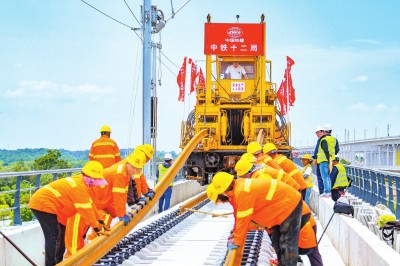 荆荆铁路自荆门西站起,终点与荆州站接轨,全长77.6公里,设计时速350公里,中铁十二局独立承担全线151.18公里铺轨任务。为优质高效完成铺轨任务,施工方根据施工现场实际情况采取优化施组保铺轨、资源超配保铺轨、沟通协调保铺轨等措施,在确保质量、安全基础上,克服了长轨运输难、邻营距离长、安全风险高、交叉作业多等不利因素影响,圆满完成铺轨任务。
