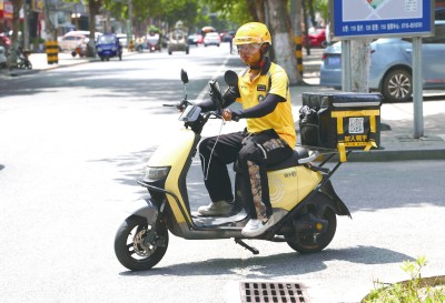 ②7月8日中午,沙市区北湖路,外卖小哥穿梭于城市街道之间,挥洒汗水,为人们送去美食。(记者 肖琦 摄)