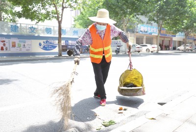 ④7月8日上午,江津西路,环卫工人冒着高温,清扫路边的落叶,还城市街道整洁干净。 (记者 肖琦 摄)