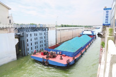 近日,在江汉运河荆州区李埠镇段,运输船舶正有序通过江汉运河船闸。