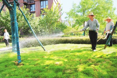 ▶8月3日,在沙市区碧桂园新城楚天府小区,绿化养护人员正在浇水灌溉草坪,打造小区靓丽的夏日风景线。 (记者 潘路 通讯员 付晓焜 摄)