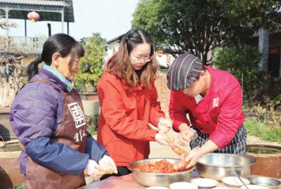 春节将近,年味渐浓,年货市场腾起浓浓“烟火气”。图为村民在马家寨乡东辰草堂灌香肠、打鱼糕,迎接新年到来。 (李紫薇 摄)