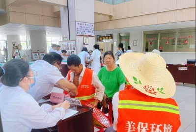 近日,县城市管理执法局联合县中医医院,开展“关爱环卫工人、健康三伏行”公益活动,为环卫工人免费开展健康体检、贴敷三伏贴,讲解健康知识。(陈丽华 摄)
