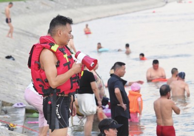 8月5日下午,长江岸线沙市区柳林洲段,前来游泳的市民群众络绎不绝,一群身着红色救生衣人员在岸边来回巡视,用话筒提醒大家注意安全。