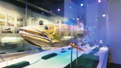 科普馆内,72岁的居民夏玉华牵着5岁的孙子小子桥,正趴在玻璃展柜前近距离观看中华鲟标本。