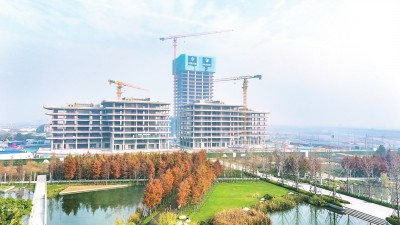 近日,荆州城市新客厅产业孵化中心(东塔)建设项目(一期)施工现场,塔吊林立、机声轰鸣,施工人员正加紧冲刺年度目标。