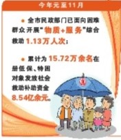 据统计,今年元至11月,全市民政部门已面向困难群众开展“物质+服务”综合救助1.13万人次;累计为15.72万余名在册低保、特困对象发放社会救助补助资金8.54亿余元,以扎实行动生动诠释了“民政为民、民政爱民”的深刻内涵。