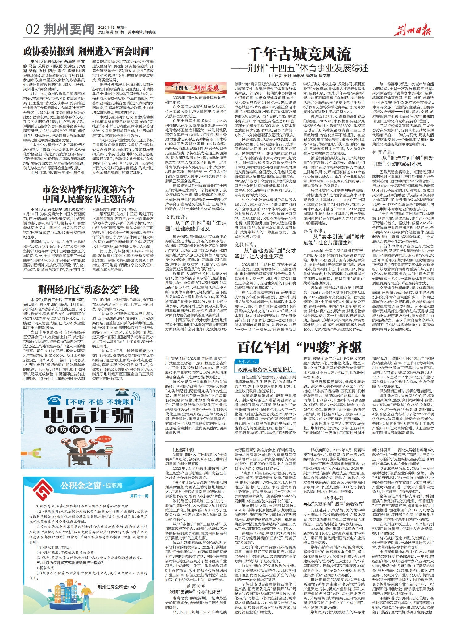 在第十五届全国运动会上,45名荆州健儿在多条战线高奏凯歌——羽毛球名将王祉怡时隔六十载助湖北队重夺女单桂冠;足球小将高速、胡贵瑩助力湖北U20队历史性摘金,市体校8名学子代表湖北男足U16队夺银;朱轩辰、潘胤龙刷新羽毛球男子项目全运最佳战绩;李贺在接力跑道上疾驰如风,助力团队取得1金1铜;向馨怡携手队友斩获三人篮球女子组银牌。群众体育战线同样表现亮眼,门球、太极拳、羽毛球等项目屡创佳绩……当3金4银1铜的成绩收入囊中,荆州竞技体育金牌数已跃居全省第三。